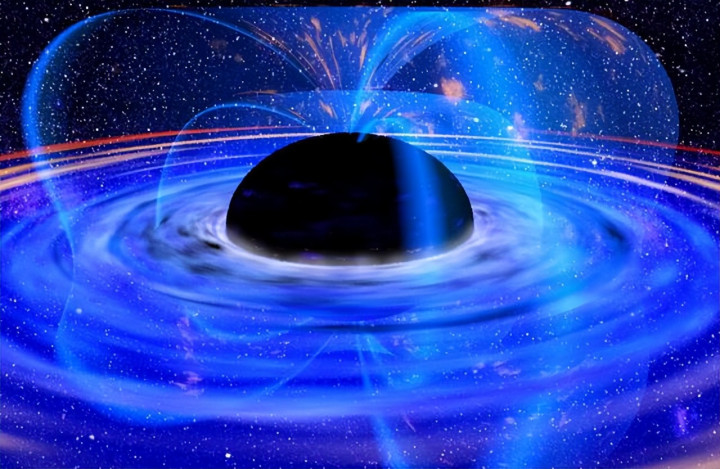 就像池塘放水时水面会转圈,恒星坍缩后残余物资也会这样转,酿成一个围绕黑洞的"物资盘",磁场在这儿就启动发力了。