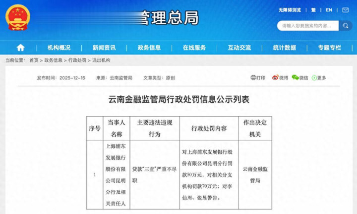 12月15日,国度金融监督处理总局云南金融监管局行政处罚信息公示列表线路,浦发银行昆明分行,因贷款“三查”严重不尽责,被罚金50万元。对子系分支机构罚金70万元;对李仙周、张昱警戒。
