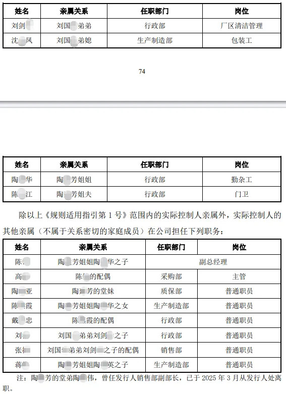 这份支属任职名单细节颇具代表性:刘国某的亲弟弟管着厂区清洁,弟妇则在出产部当包装工;陶某芳姐姐的女儿更是担任公司副总司理,凯旋参与中枢料理。